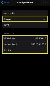 5. Select “Manual” and enter “192.168.1.2” in IP Address, “255.255.255.0” in Subnet Mask, and keep router empty.